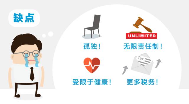 - 所有的利润都归一个人, 可能要交更多的税 - 个人需缴纳业务收入加上个人收入的总和的税务