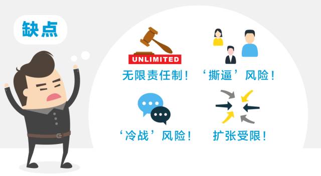 - 无限责任制 - 如果经商过程中造成别人损失, 对方可以索赔到所有合伙人的个人所有资产。即使你个人没有直接导致债务,由于‘连带责任’,你的私人资产仍然需要公平的用来清偿合作债务。